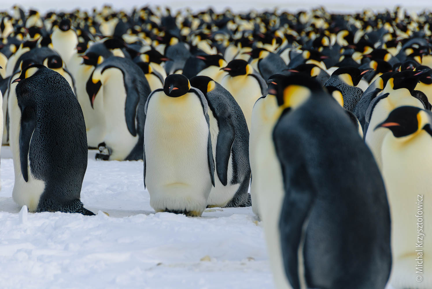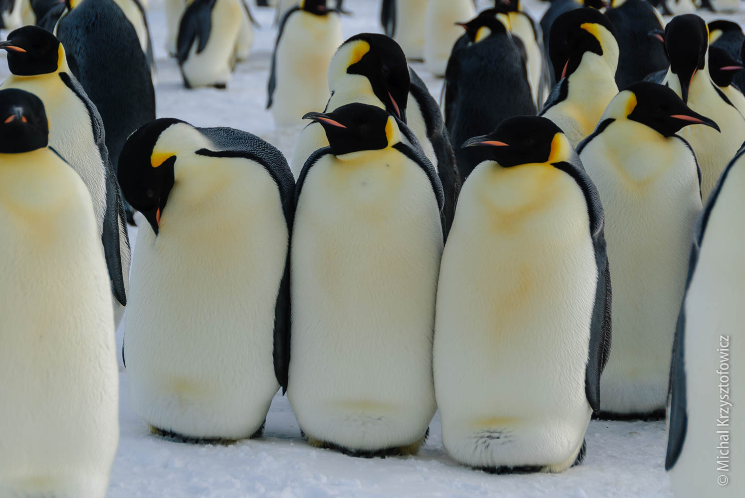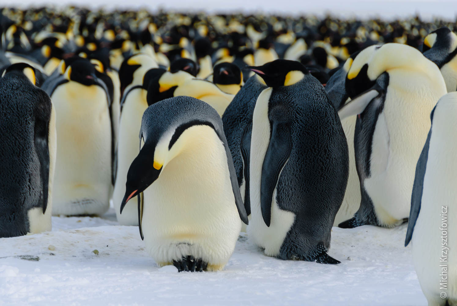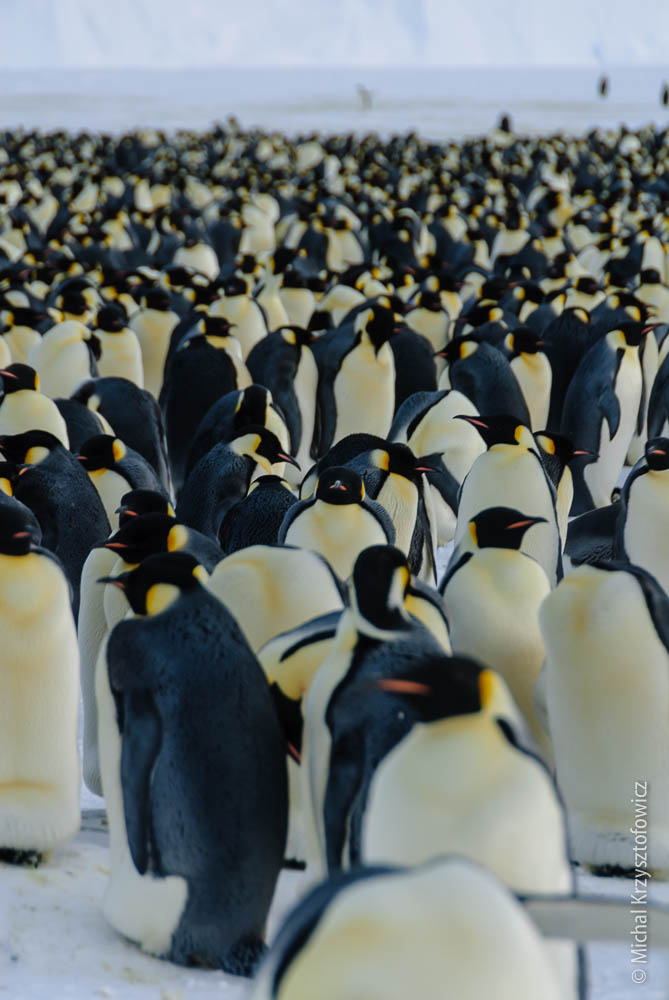 Most of the penguins stay in this great huddle, where they stand really close to each other to preserve as much heat as possible. Typically the weaker and younger ones will be somewhere in the centre of the huddle. The whole huddle constantly keeps shifting, so that the penguins which are outside get a bit of a break once in a while and migrate inward to get some more heat.