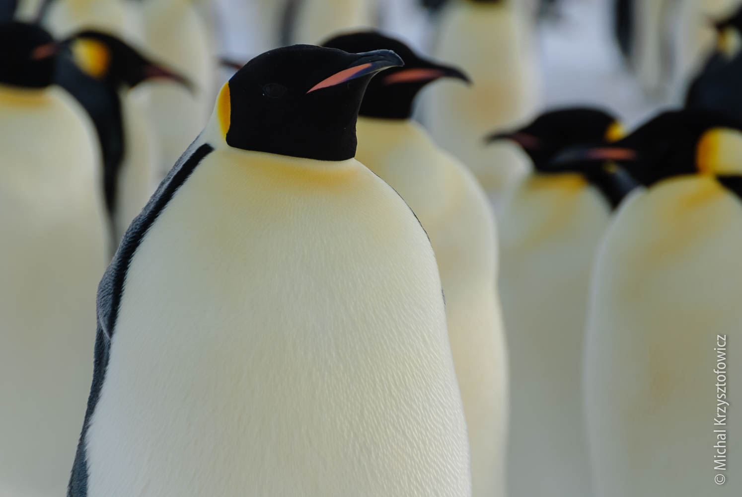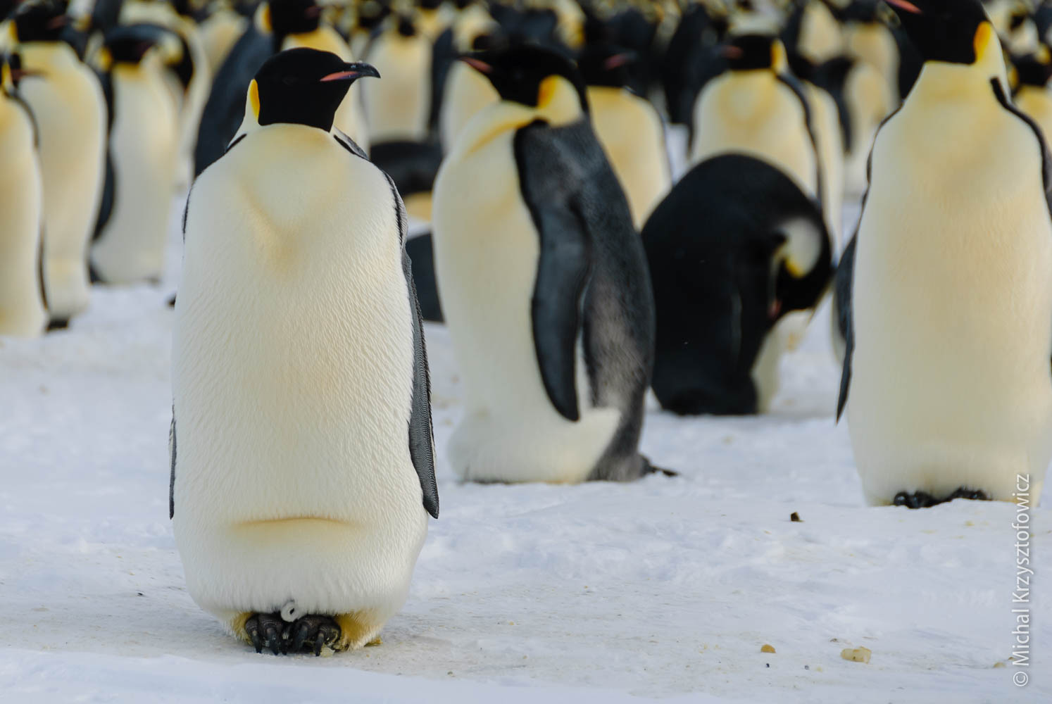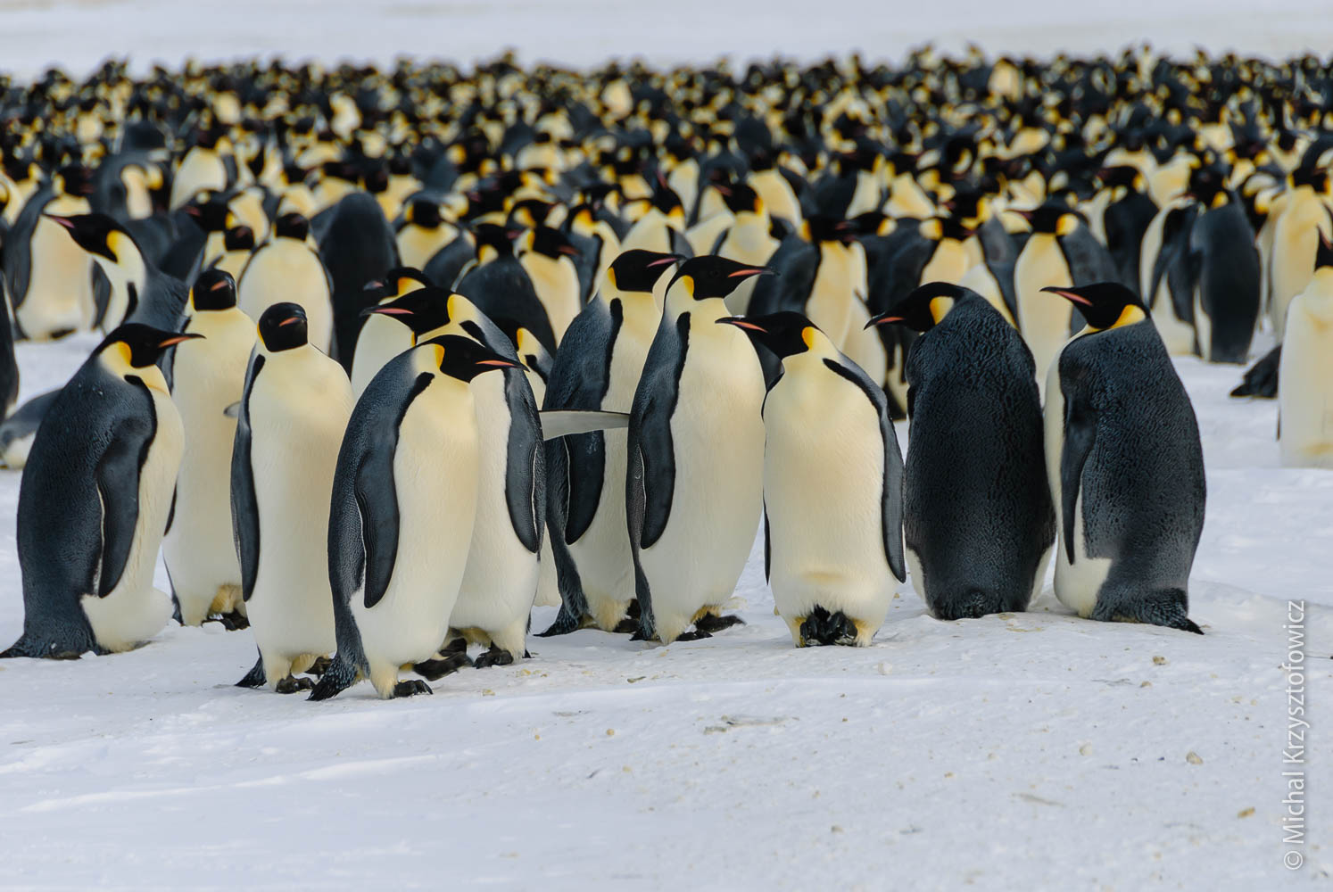 Most of the penguins stay in this great huddle, where they stand really close to each other to preserve as much heat as possible. Typically the weaker and younger ones will be somewhere in the centre of the huddle. The whole huddle constantly keeps shifting, so that the penguins which are outside get a bit of a break once in a while and migrate inward to get some more heat.