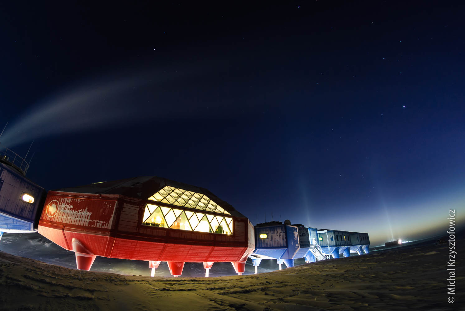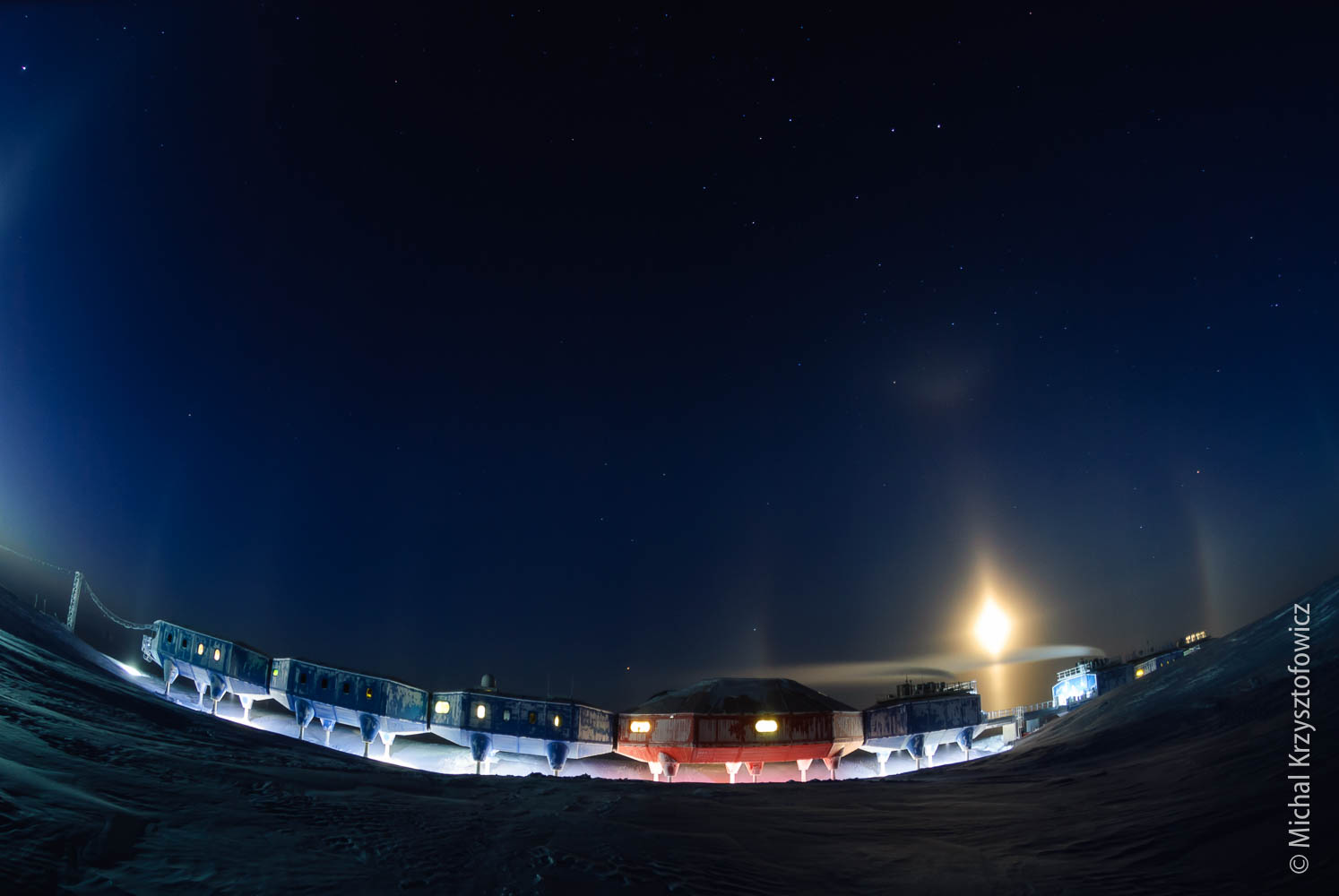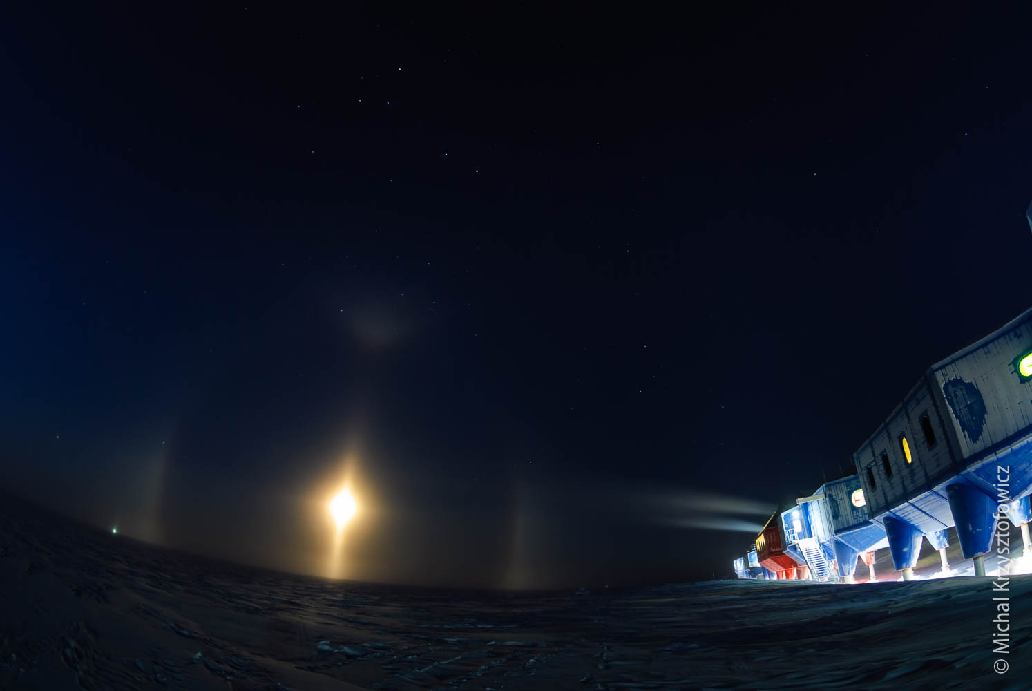 It turns out that the same Diamond Dust can cause similar effects with all sources of light.Today I have a couple of shots of Halley VI station with the moon overhead, with a really nice Moon Halo, Moon Dogs, the Upper Tangent Arc and a Moon Pillar.