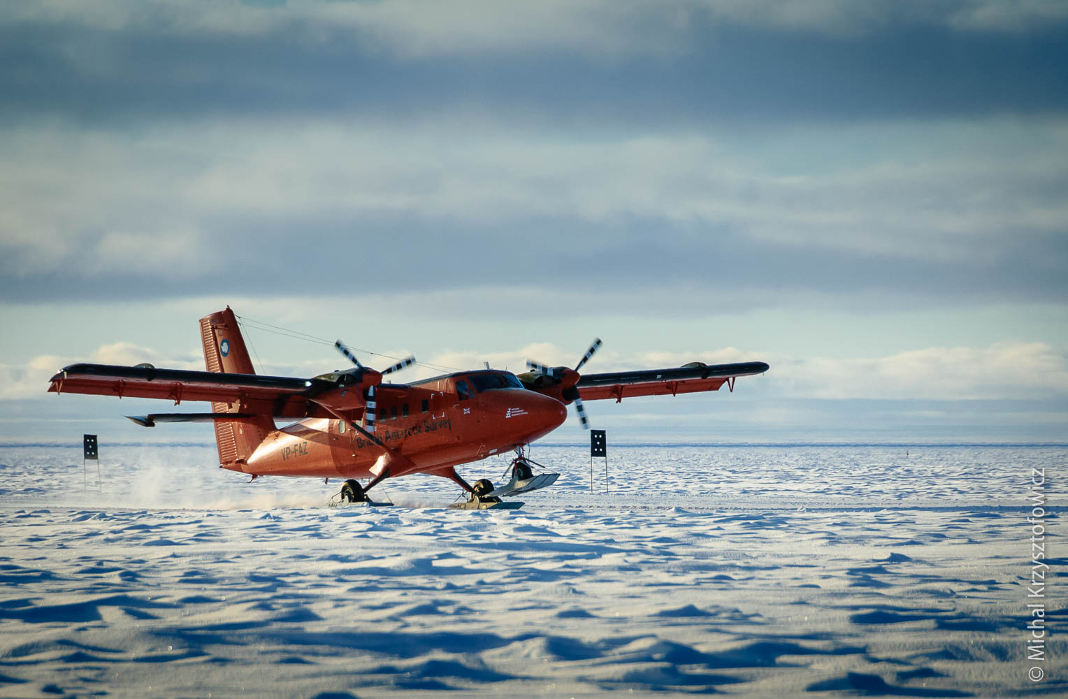 We then went on to try the Blind Landing Site, which is located to the East of Halley. The idea behind it is to have a site which is free of obstacles (both manmade, like buildings, vehicles, etc, as well as natural, like slots and crevasses) and which could be used for landing in poor visibility. The technique that Ian used was to touchdown and trail the skis on the ice, while having the throttle open so that in case a slot decided to open, we could take off. That’s the theory at least! We also went looking for our tracks, but because the ice is relatively hard and there’s not much fresh snow at all, we couldn’t see them.