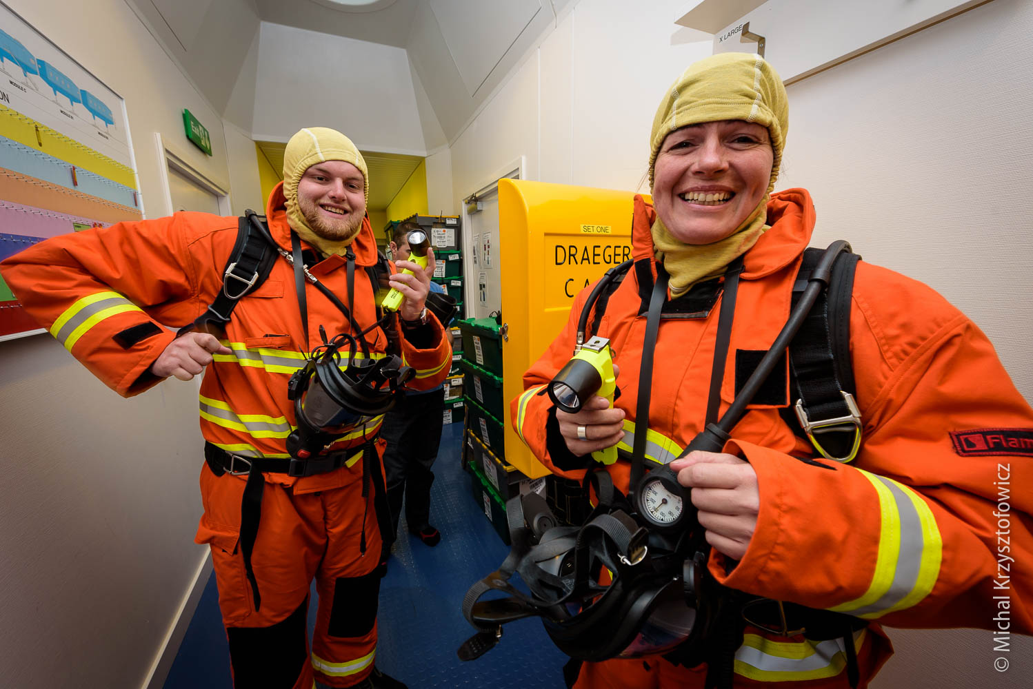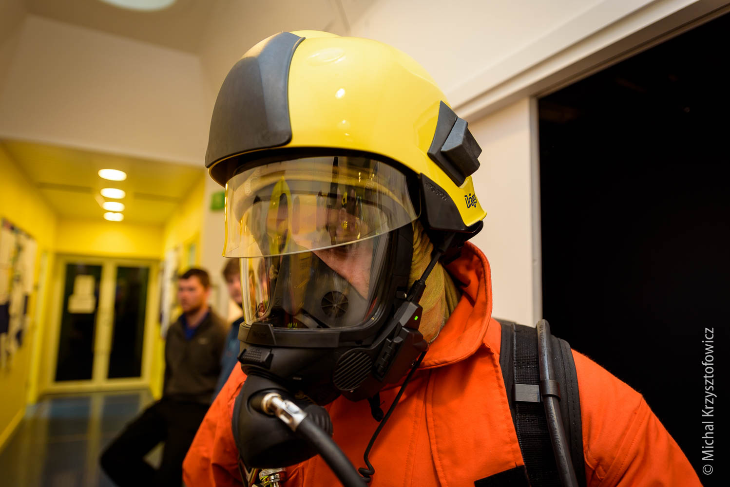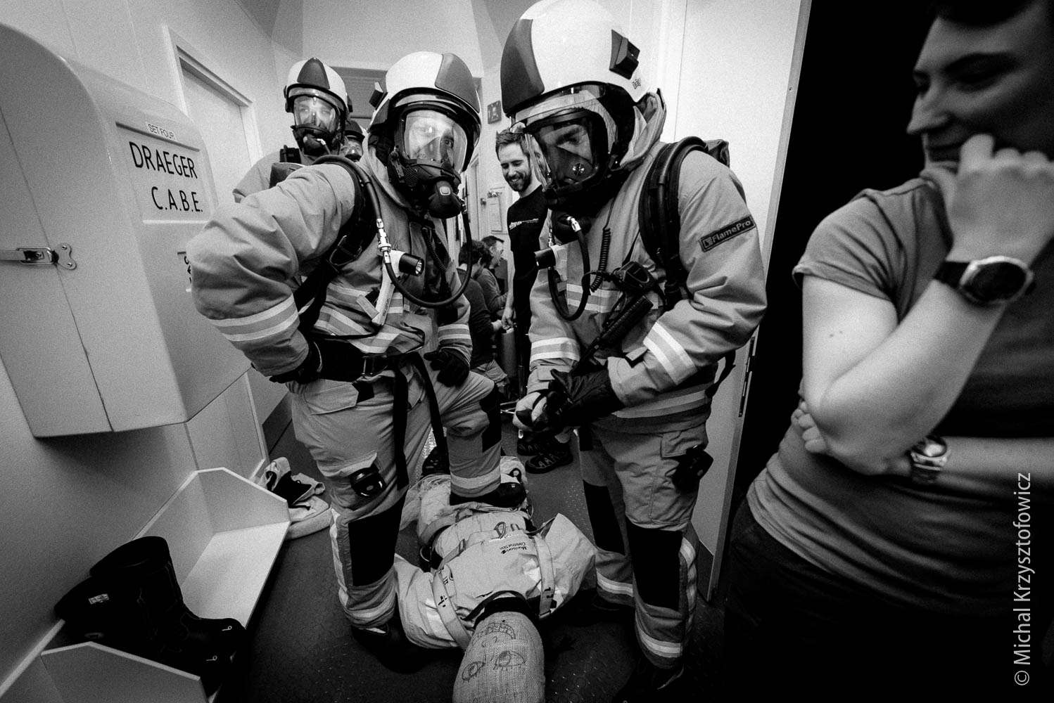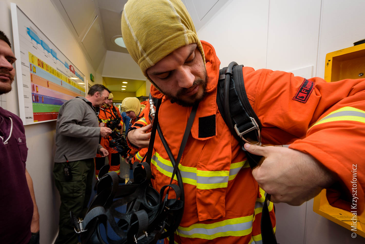 The second half of the morning we went through the Breathing Apparatus equipment, which is a fancy name for all the fire kit we have. We practiced donning and using the equipment, which is not that dissimilar to diving gear with full face mask. We also went through the motions of a simple room search and rescue of Fred the Dead (our dummy casualty) and procedures for gas management, running the fire board (which contains all information about who went in, how much time they have, etc) and finally, after the drill, how to replace the air cylinders with new ones.
