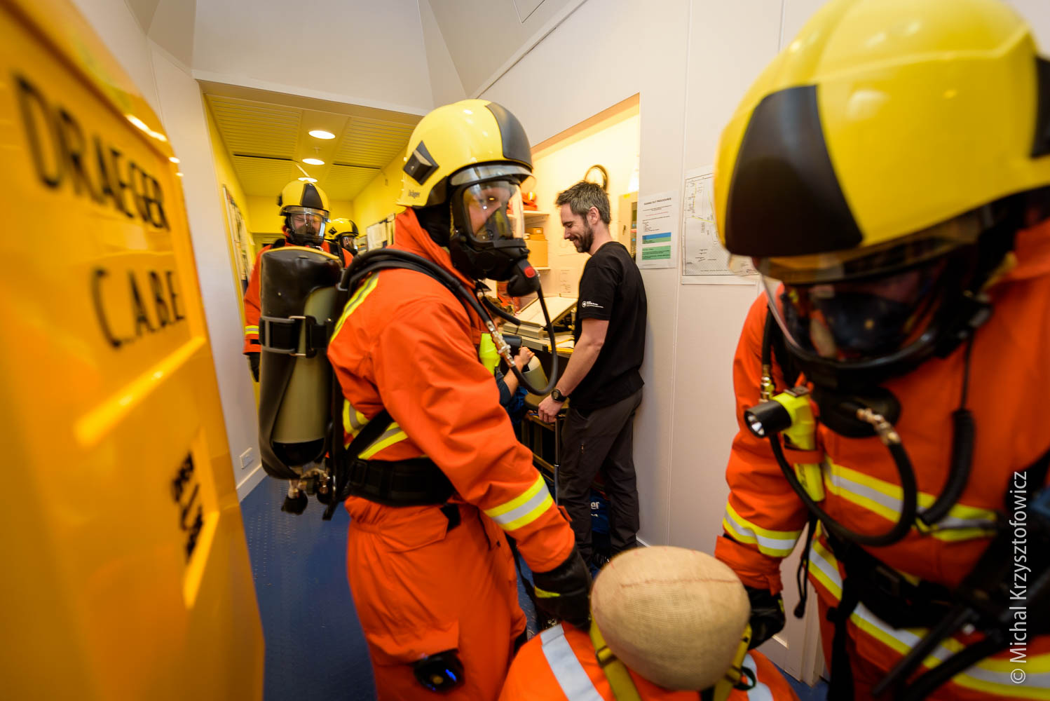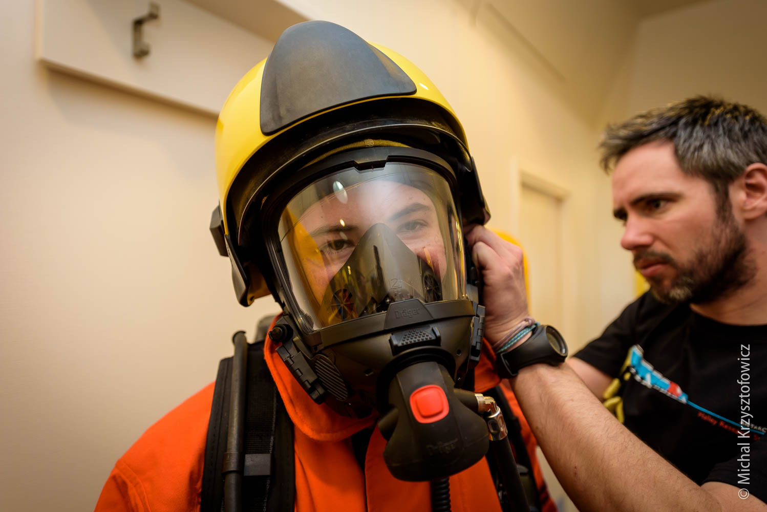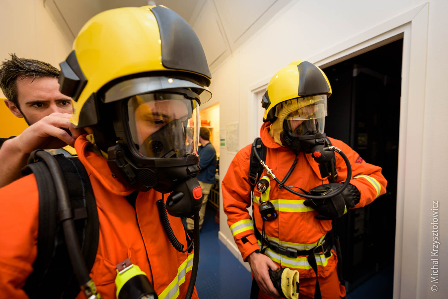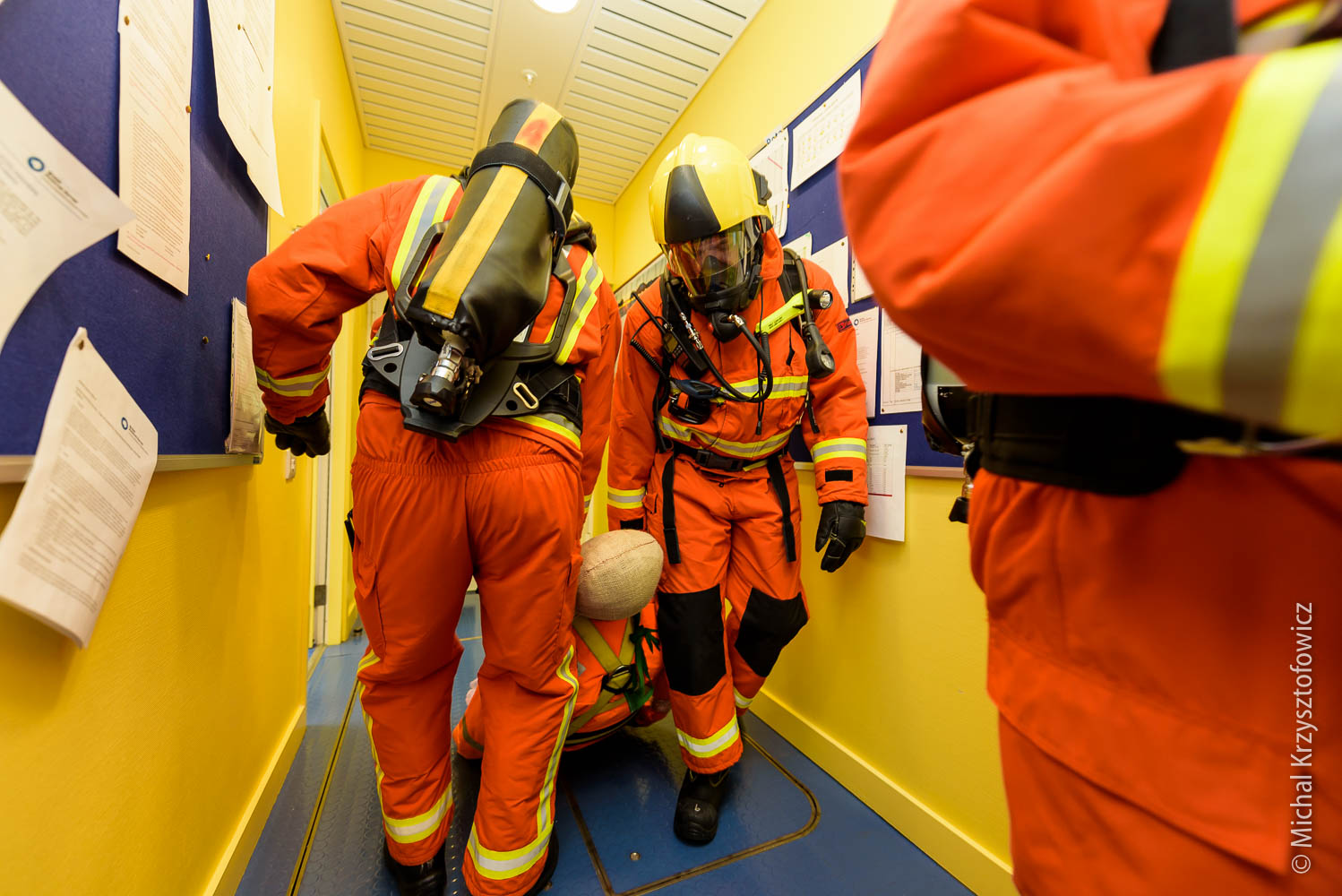 The second half of the morning we went through the Breathing Apparatus equipment, which is a fancy name for all the fire kit we have. We practiced donning and using the equipment, which is not that dissimilar to diving gear with full face mask. We also went through the motions of a simple room search and rescue of Fred the Dead (our dummy casualty) and procedures for gas management, running the fire board (which contains all information about who went in, how much time they have, etc) and finally, after the drill, how to replace the air cylinders with new ones.