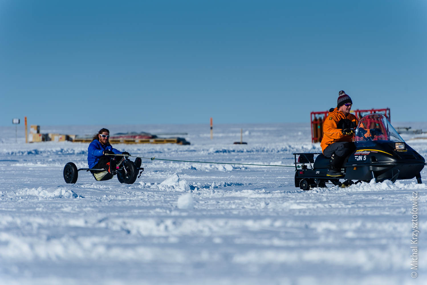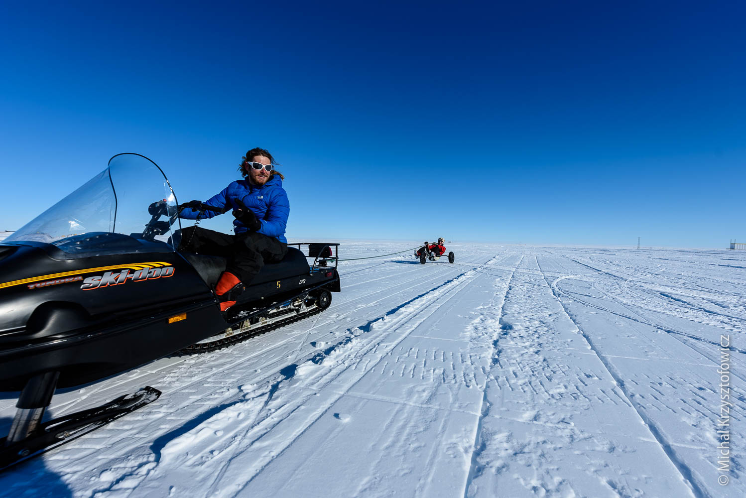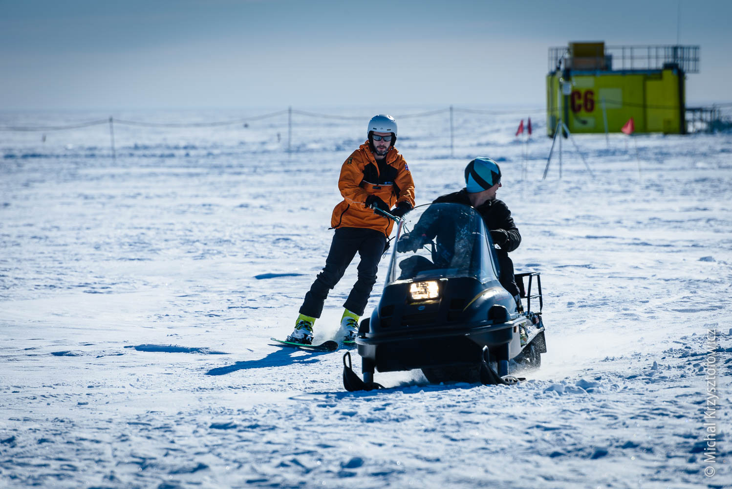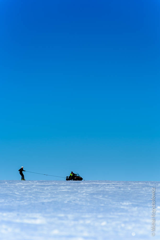 We’ve been blessed with the weather so far, with only one or two days of high-ish winds and bad visibility. Now that I’m so happy kite skiing, my ideal weather would be 15 knots and sunshine, but we also had a few days with no or very little wind, and on those we do skijoring. Skijoring, in the Antarctic parlance, is an act of being dragged behind the skidoo, while using skis, a snowboard, a buggy, or anything else that you can use to slide on the snow. It’s almost as good fun as kiting!