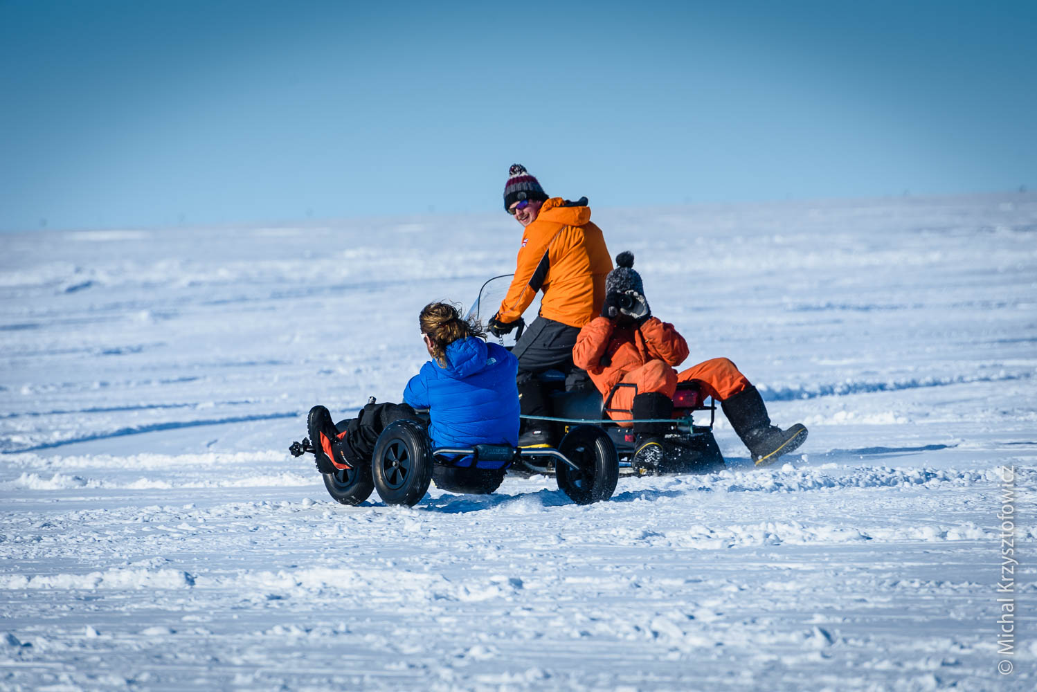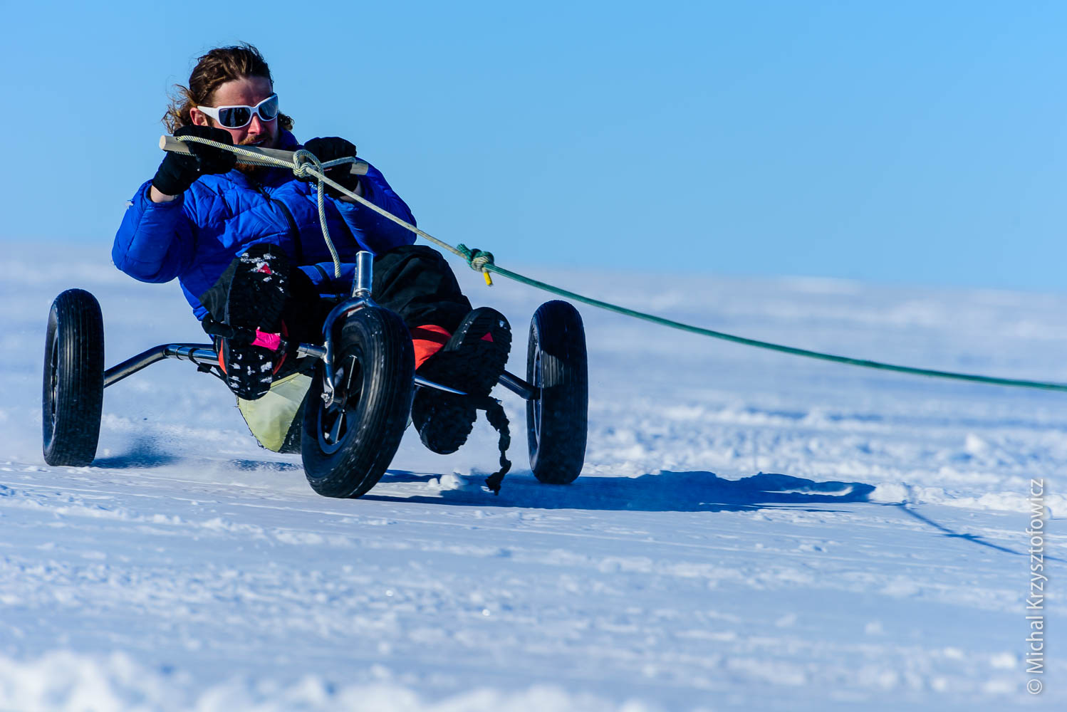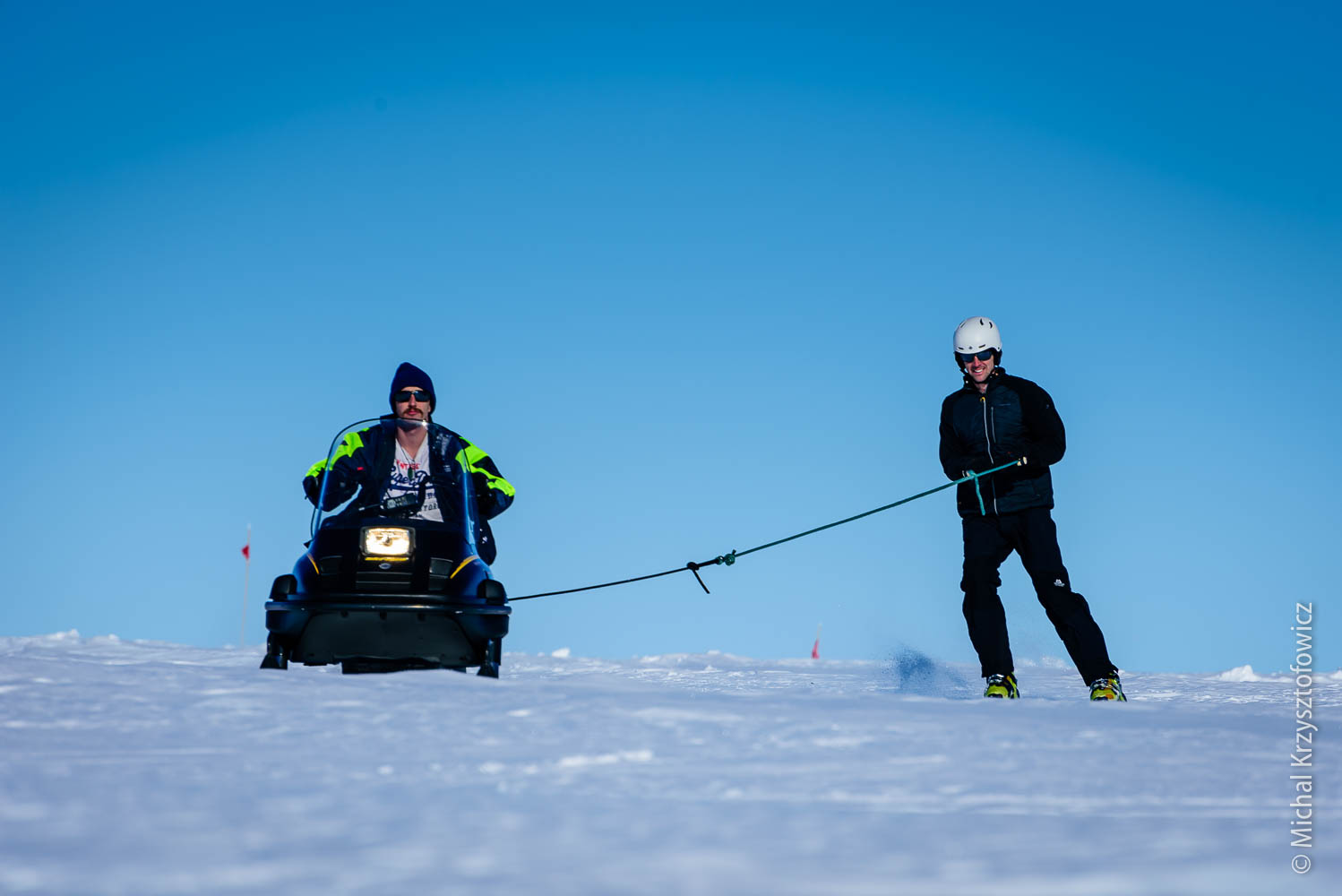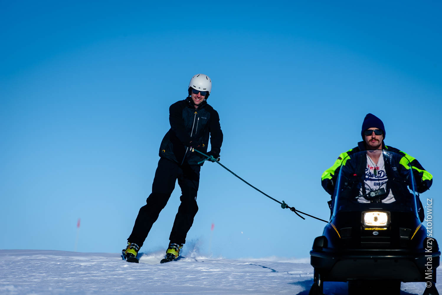 We’ve been blessed with the weather so far, with only one or two days of high-ish winds and bad visibility. Now that I’m so happy kite skiing, my ideal weather would be 15 knots and sunshine, but we also had a few days with no or very little wind, and on those we do skijoring. Skijoring, in the Antarctic parlance, is an act of being dragged behind the skidoo, while using skis, a snowboard, a buggy, or anything else that you can use to slide on the snow. It’s almost as good fun as kiting!