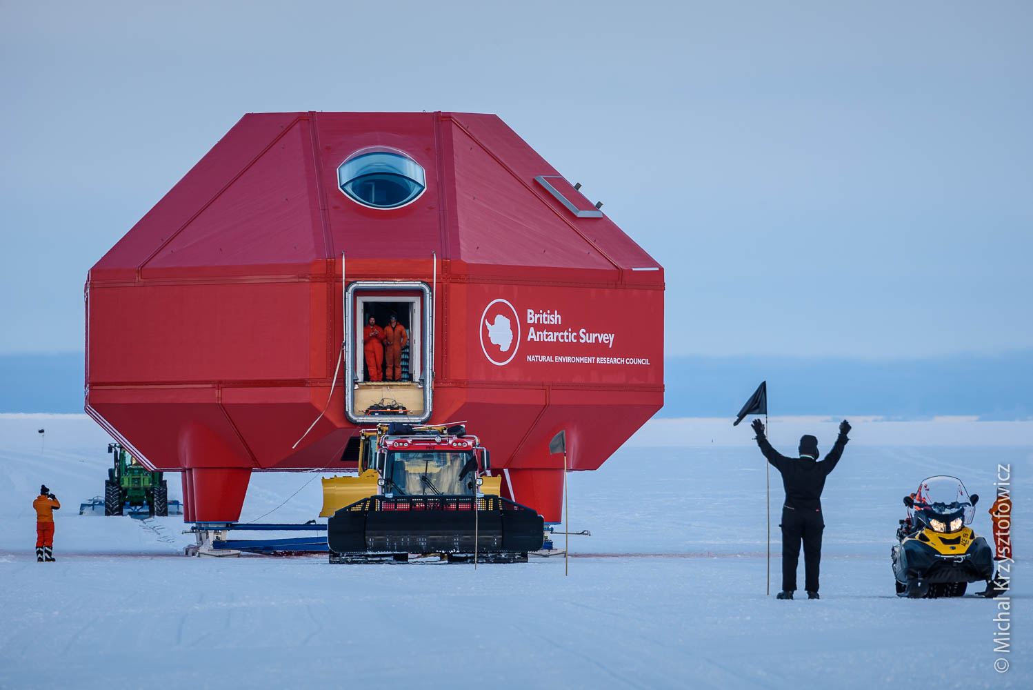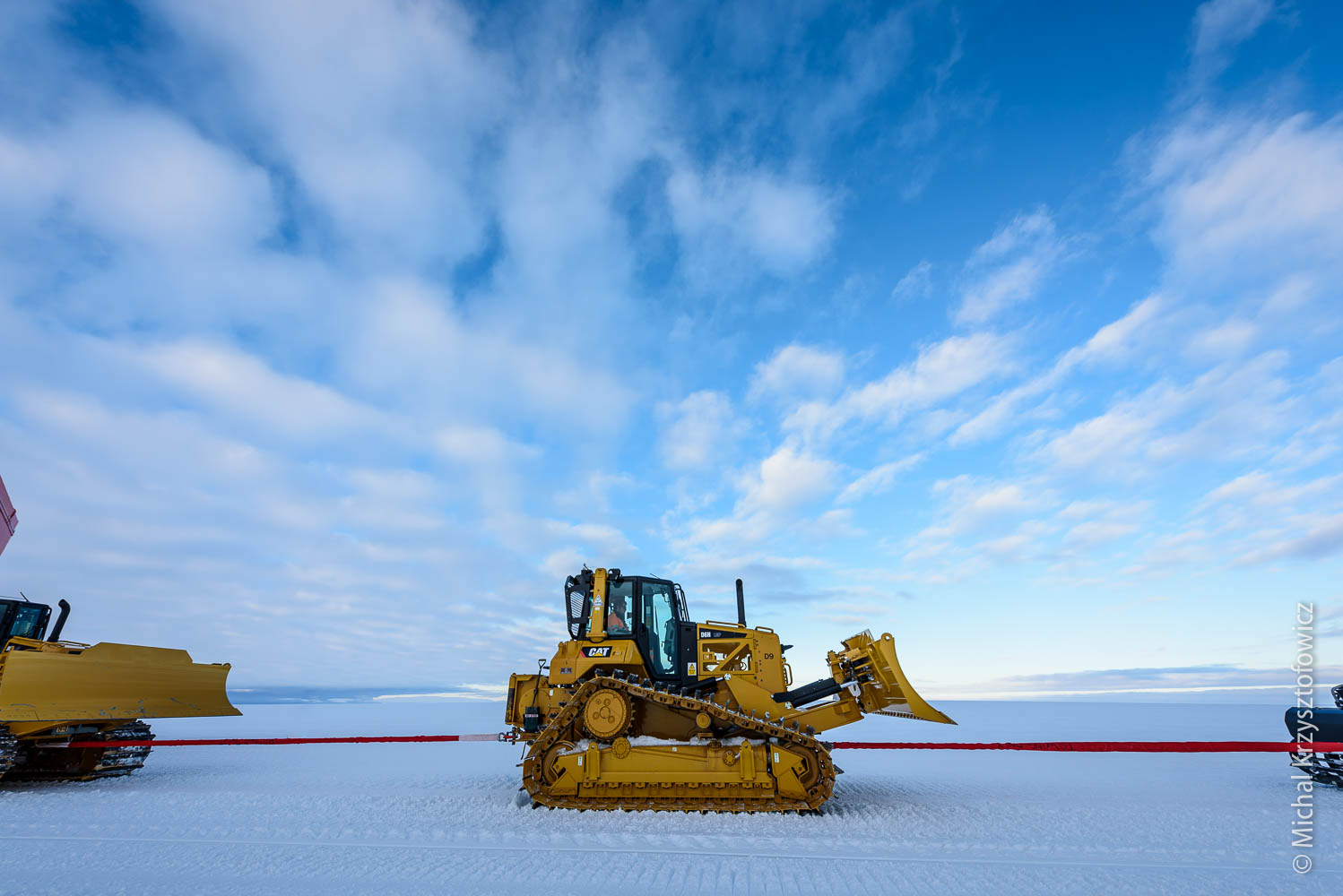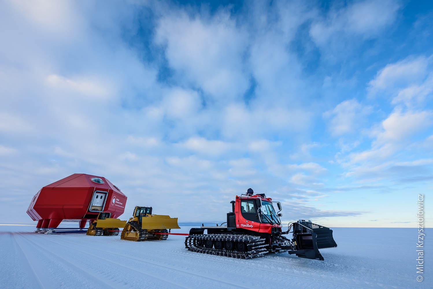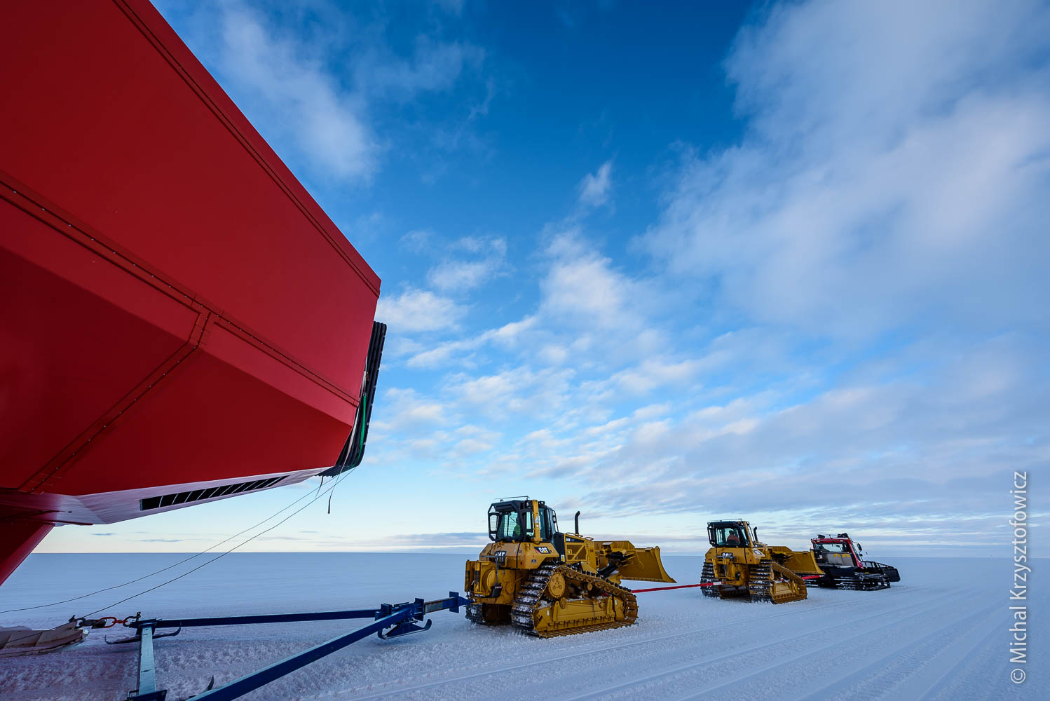 The A Module got rigged up just before the dinner in preparation for the move, and shortly after it has been fully lowered on its hydraulic legs. Similarly as before, three vehicles were used for the tow: two Caterpillar D6 Bulldozers were the main pulling force, with a Pisten Bully as a lead vehicle, helping.