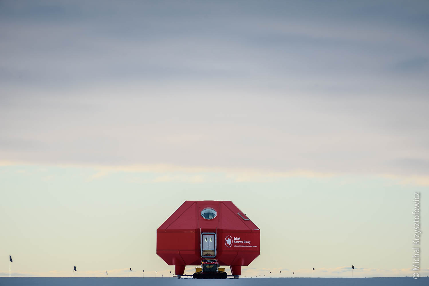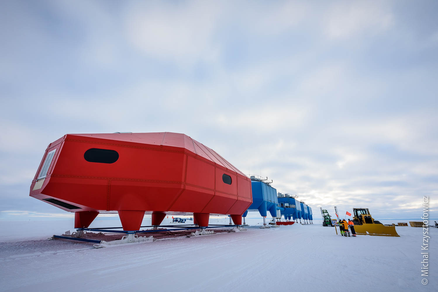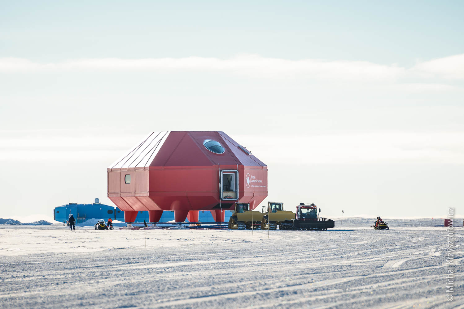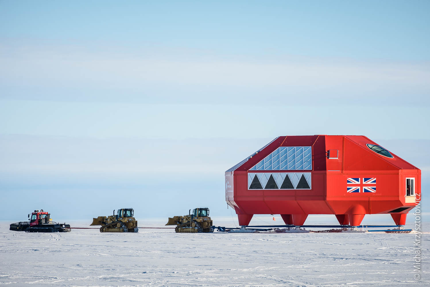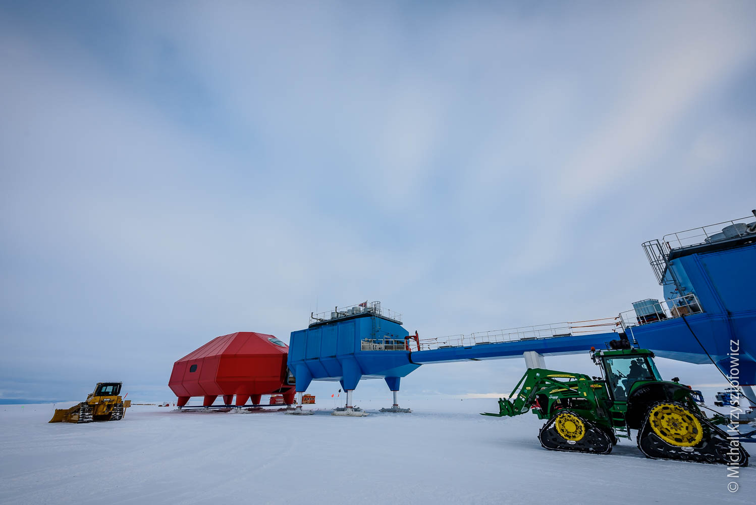 The A Module got rigged up just before the dinner in preparation for the move, and shortly after it has been fully lowered on its hydraulic legs. Similarly as before, three vehicles were used for the tow: two Caterpillar D6 Bulldozers were the main pulling force, with a Pisten Bully as a lead vehicle, helping.