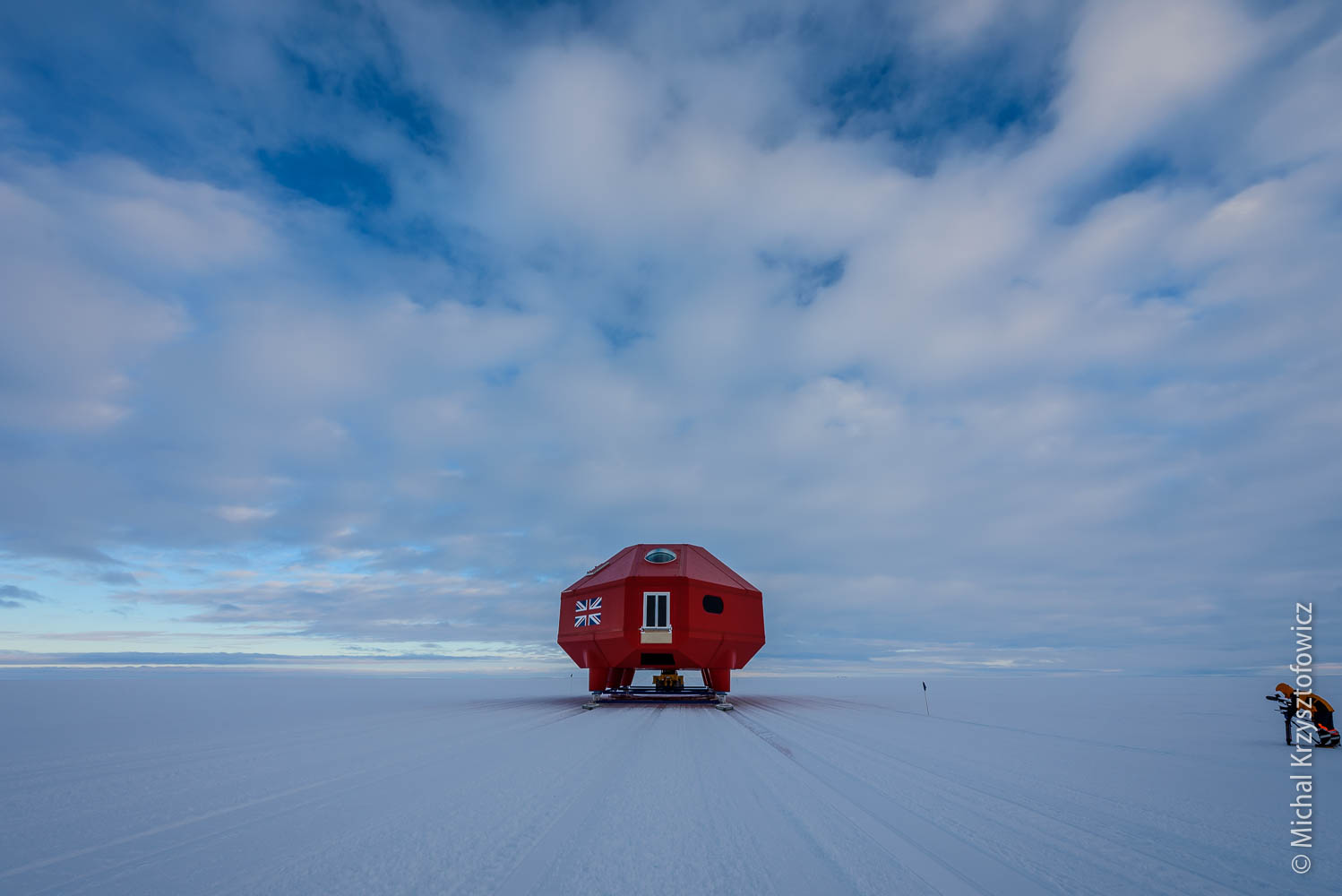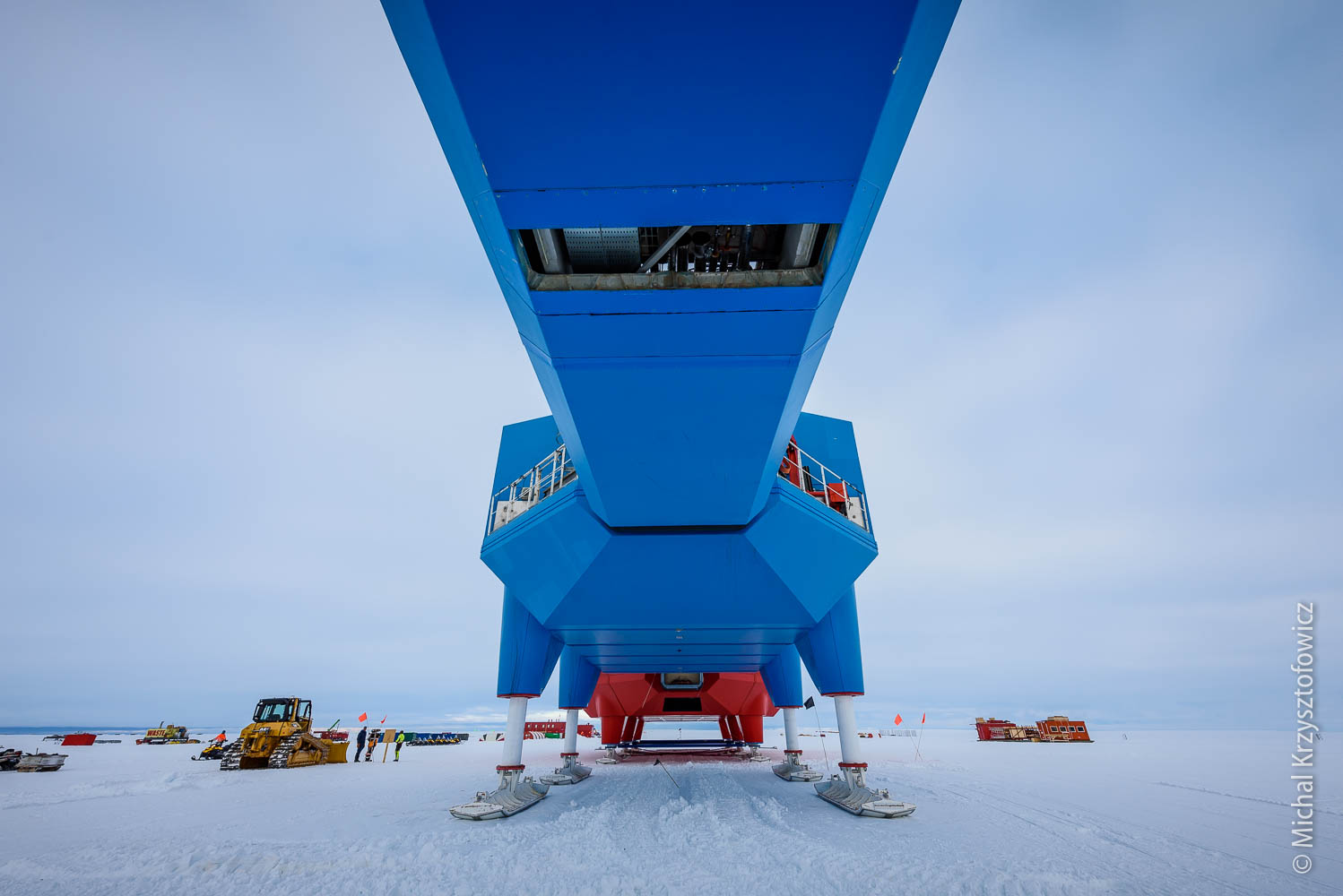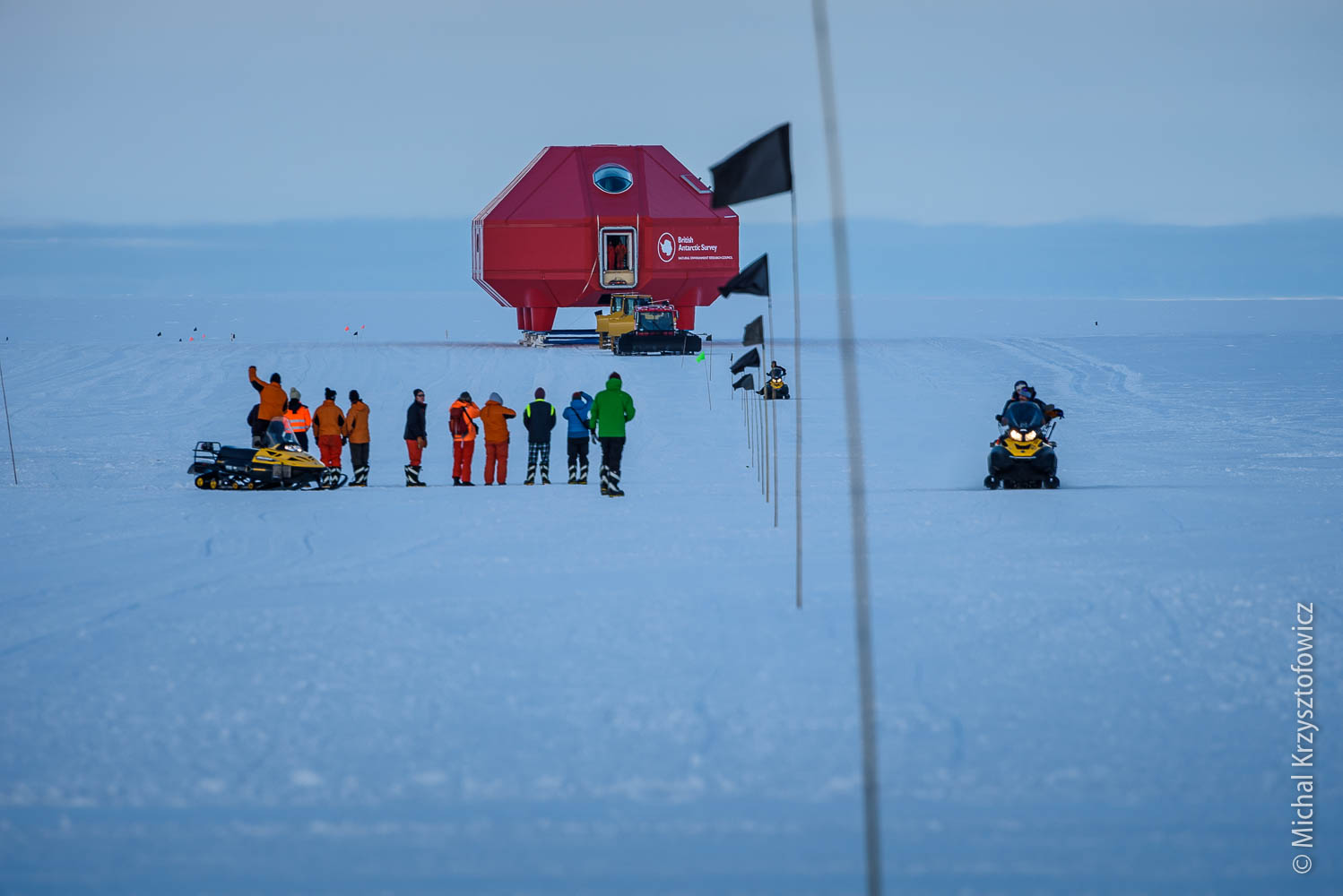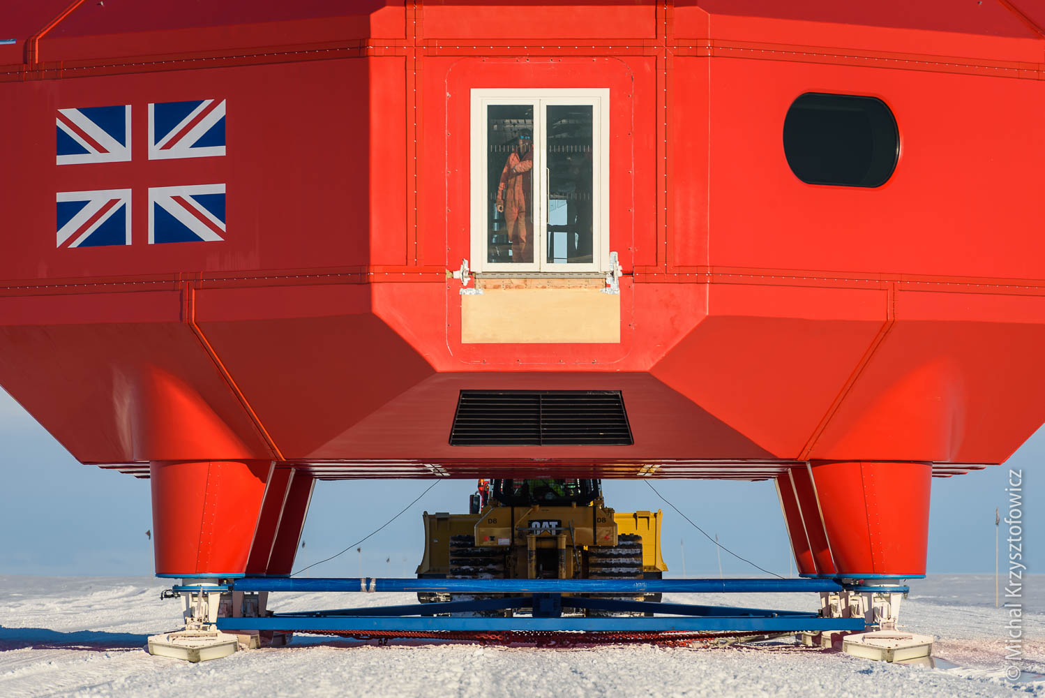 The A Module got rigged up just before the dinner in preparation for the move, and shortly after it has been fully lowered on its hydraulic legs. Similarly as before, three vehicles were used for the tow: two Caterpillar D6 Bulldozers were the main pulling force, with a Pisten Bully as a lead vehicle, helping.