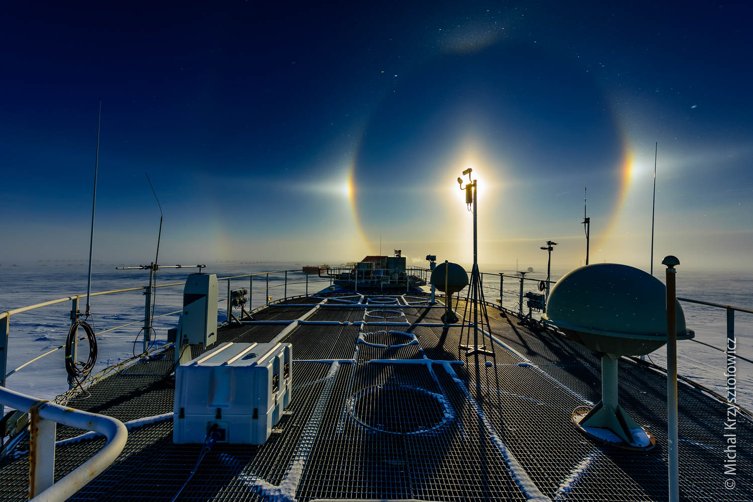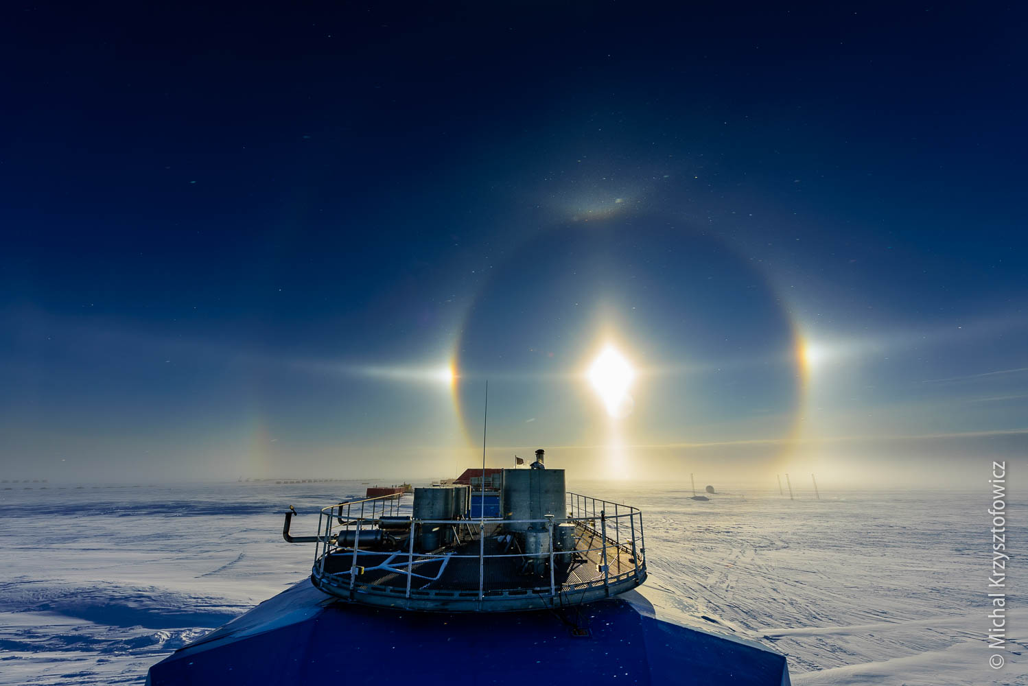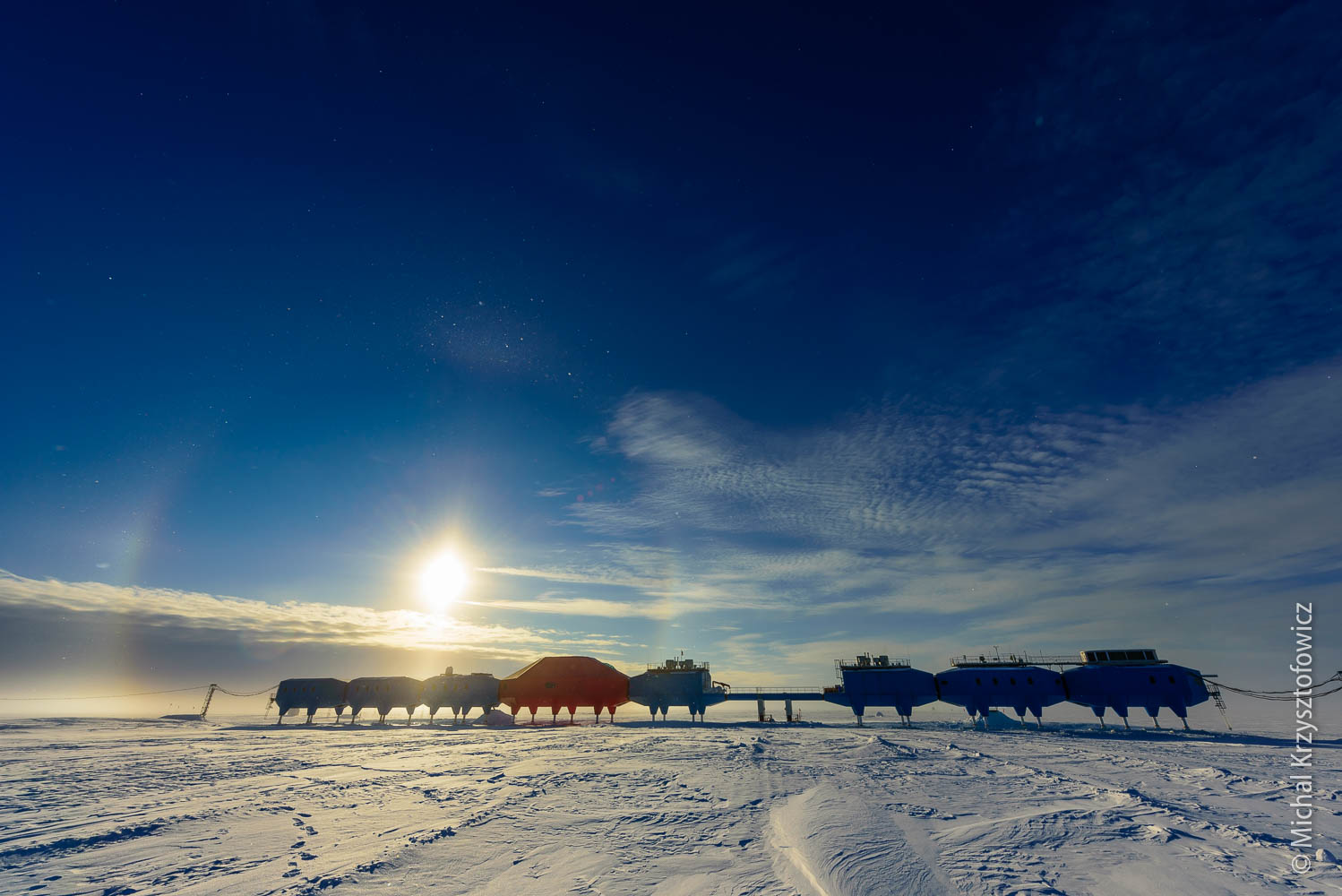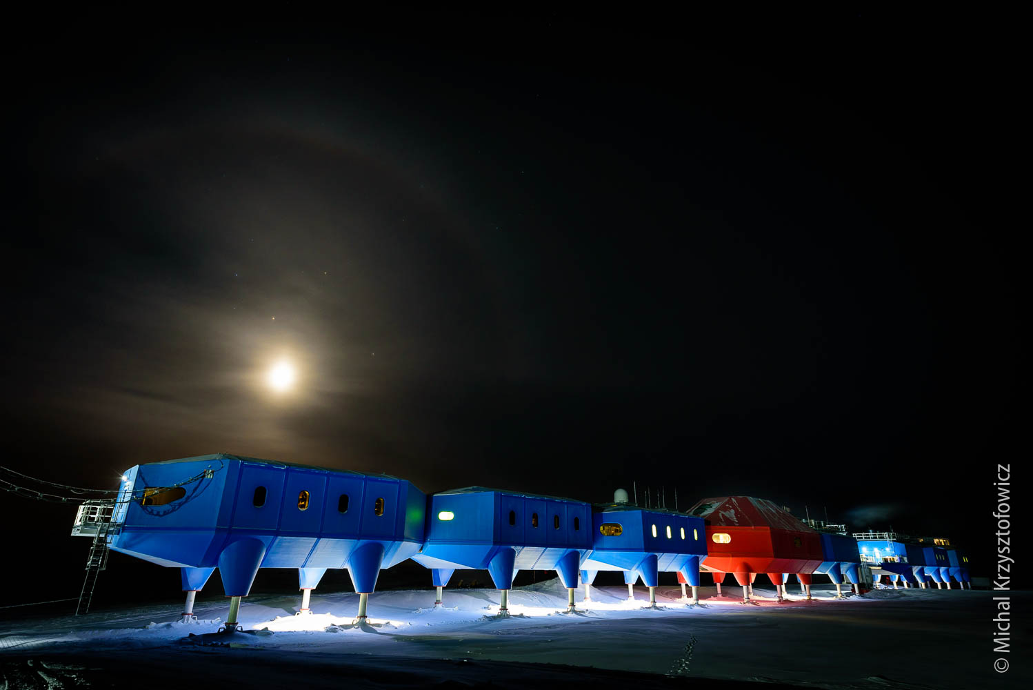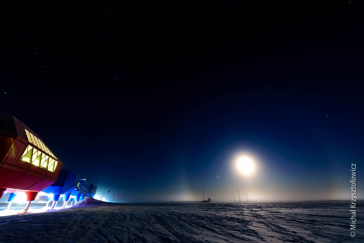 Other phenomena that we’ve seen included really cool moon rises. As Halley is located on a flat Ice Shelf, with nothing blocking the horizon, we can see the Moon as it’s touching the horizon at moon rise or moon set. If you add to it some stratified layers of cold air (each layer with a slightly different temperature), the moon rises are really unusual, with the moon’s shape quite distorted.
